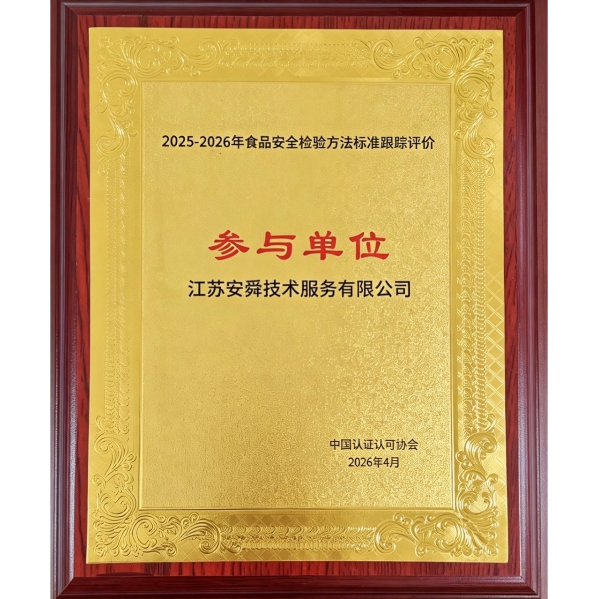 安舜检测荣获食品安全检验方法标准跟踪评价“参与单位”官方证书